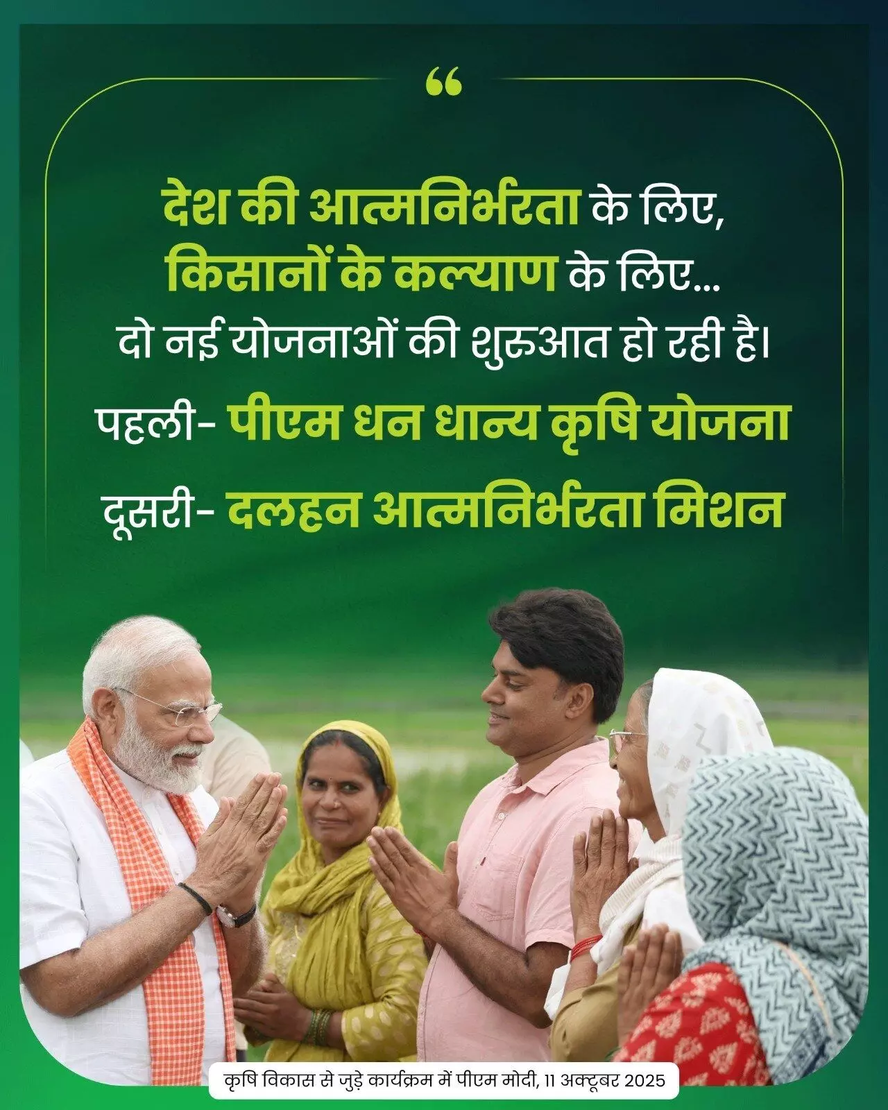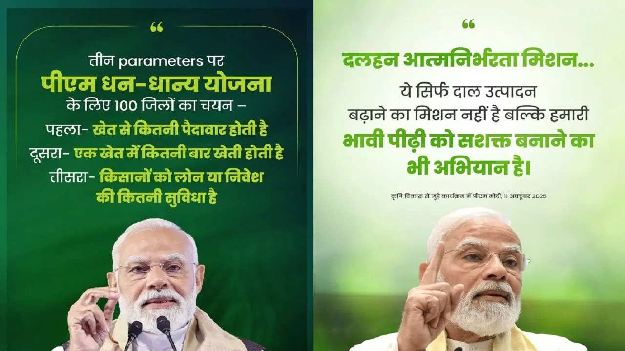 देश के किसानों के लिए एक नहीं दो बड़ी खुशखबरी हैं। प्रधानमंत्री नरेंद्र मोदी ने शनिवार को दिल्ली के पूसा परिसर (भारतीय कृषि अनुसंधान संस्थान) से प्रधानमंत्री धन-धान्य कृषि योजना (PMDDKY) और दलहन आत्मनिर्भरता मिशन का औपचारिक शुभारंभ किया है। ये दोनों योजनाएं कुल 35,440 करोड़ रुपये की हैं, जिनमें PMDDKY के लिए 1.44 लाख करोड़ (6 वर्षों में, प्रति वर्ष 24,000 करोड़) और दलहन मिशन के लिए 11,440 करोड़ का बजट है।