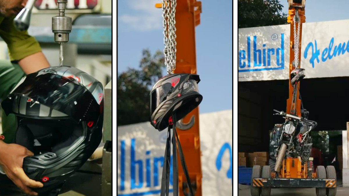 स्टीलबर्ड का हेलमेट कितना मजबूत है, इसका पता लगाने के लिए इस हेलमेट के साथ कंपनी ने अनोखा टेस्ट किया। इसके लिए कंपनी ने हेलमेट से मोटरसाइकिल को लटकाकर टेस्ट करने का फैसला लिया। ऐसे में इस फुल फेस हेलमेट में सबसे पहले ड्रिल की मदद से छेद किया गया। फिर इस छेद में एक चेन को हुक की मदद से फिक्स किया गया। इसके बाद हेलमेट में इस्तेमाल होने वाला बकल में कुछ स्ट्रिप बांधी गईं। फिर इन स्ट्रिप में एक KTM मोटरसाइकिल को बांध दिया गया।