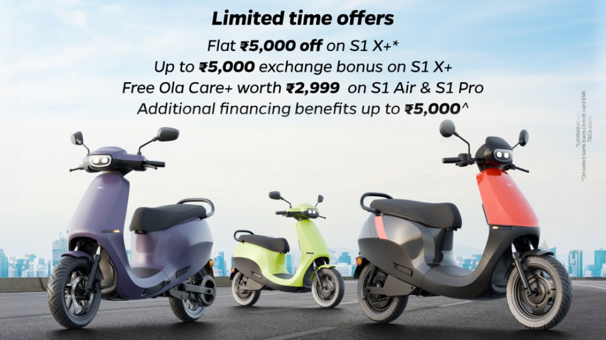 कंपनी अपने S1 X+ पर 5,000 रुपए की फ्लैट छूट के साथ-साथ क्रेडिट कार्ड EMI पर 5,000 रुपए तक का कैशबैक दे रही है। इसके साथ 5,000 रुपए तक का एक्सचेंज बोनस (केवल क्रेडिट कार्ड EMI पर) भी मिलेगा है। S1 X+ मॉडल पर चुनिंदा बैंकों से लोन लेने पर 5,000 रुपए तक का कैशबैक अलग से मिलेगा। इसके अलावा, S1 Pro और S1 Air खरीदने वाले ग्राहकों को 2,999 रुपए की कीमत का ओला केयर प्लस सब्सक्रिप्शन फ्री मिलेगा। इसके अलावा, ग्राहक S1 Pro और Air के लिए चुनिंदा क्रेडिट कार्ड EMI पर 5,000 रुपए तक का कैशबैक ले सकते हैं।