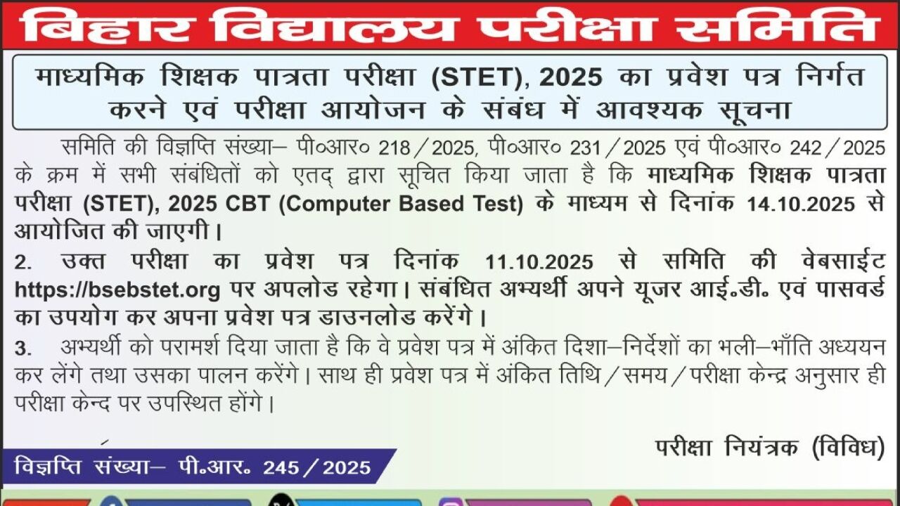 Bihar STET Admit Card: बिहार स्कूल एग्जामिनेशन बोर्ड (BSEB) ने Bihar STET Admit Card 2025 जारी करने की तारीख घोषित कर दी है। उम्मीदवार 11 अक्टूबर 2025 से अपना एडमिट कार्ड आधिकारिक वेबसाइट bihar-stet.com से डाउनलोड कर सकेंगे।