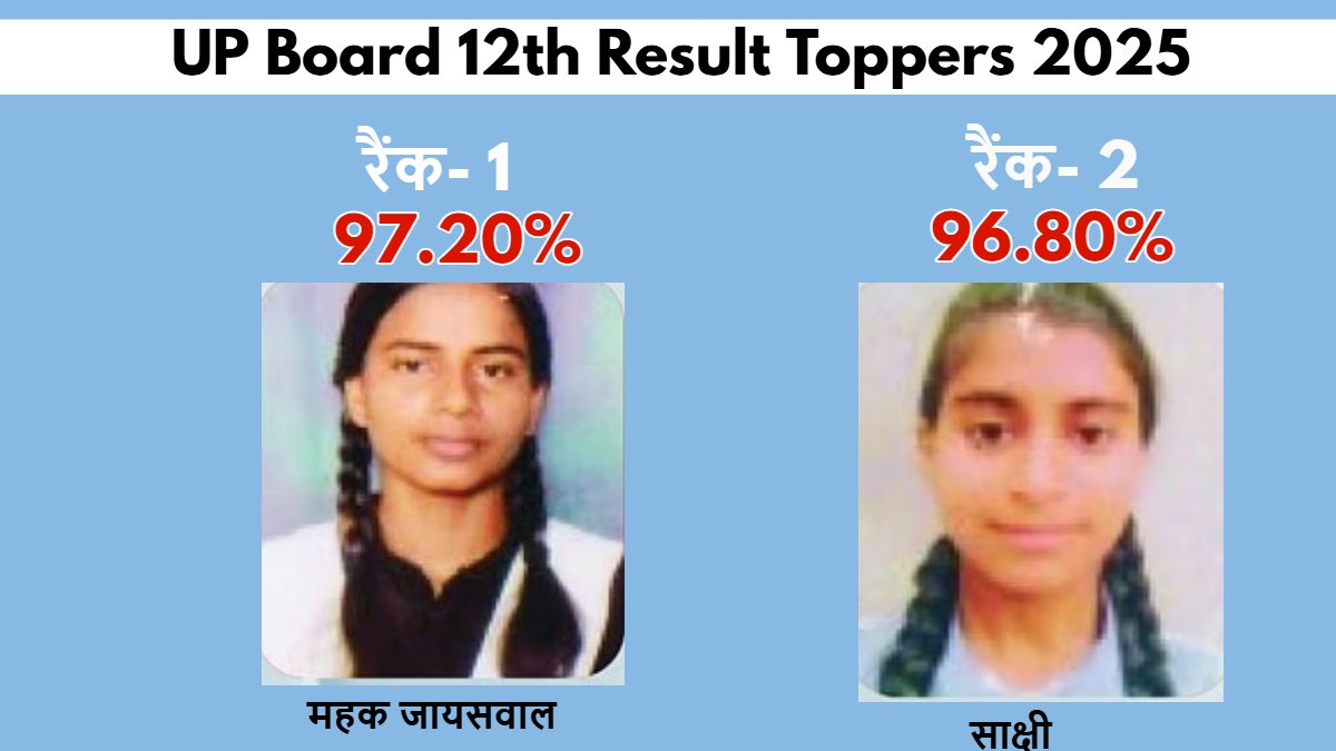 UP Board Class 12th Result Toppers 2025: उत्तर प्रदेश माध्यमिक शिक्षा परिषद (UPMSP) ने 25 अप्रैल को यूपी बोर्ड 12वीं (इंटरमीडिएट) परीक्षा के परिणाम घोषित कर दिए हैं। इस साल महक जायसवाल ने यूपी बोर्ड 12वीं परीक्षा में टॉप किया है। प्रयागराज की रहने वाली महक ने 97.20% अंकों के साथ 12वीं में टॉप किया। दूसरे नंबर पर साक्षी है जिन्होंने 12वीं में 96.80% हासिल किए। इसी के साथ यूपी बोर्ड कक्षा 12वीं के टॉपर्स की सूची भी जारी हो गई है। यहां देखिए टॉप 10 स्टूडेंट्स की लिस्ट: