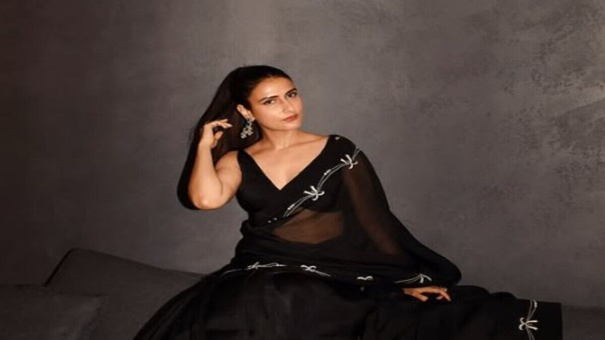 एक्ट्रेस फातिमा सना शेख ने ब्लैक साड़ी में अपना ग्लैमरस लुक शेयर किया, जिसे न्यूड मेकअप और झुमकों ने बनाया और भी खास।