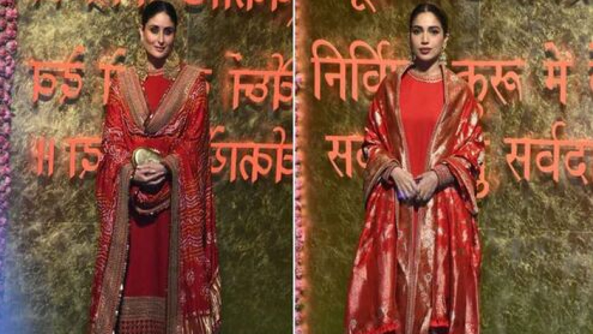 बॉलीवुड का हमेशा से फैशन की दुनिया के साथ गहरा रिश्ता रहा है, जहां अभिनेत्रियां नए ट्रेंड में फोटोशूट कराती हुई नजर आती हैं या फिर अपने लुक्स को लेकर चर्चा में बनी रहती हैं। वहीं नए फैशन का लोग बेसब्री से इंतजार करते हैं। इसी बीच बॉलीवुड की दो सबसे पसंदीदा अभिनेत्रियां, करीना कपूर खान और भूमि पेडनेकर, दोनों ने अंबानी परिवार की तरफ से आयोजित किए गए गणेश चतुर्थी समारोह में सब्यसाची सूट पहना हुआ है।
