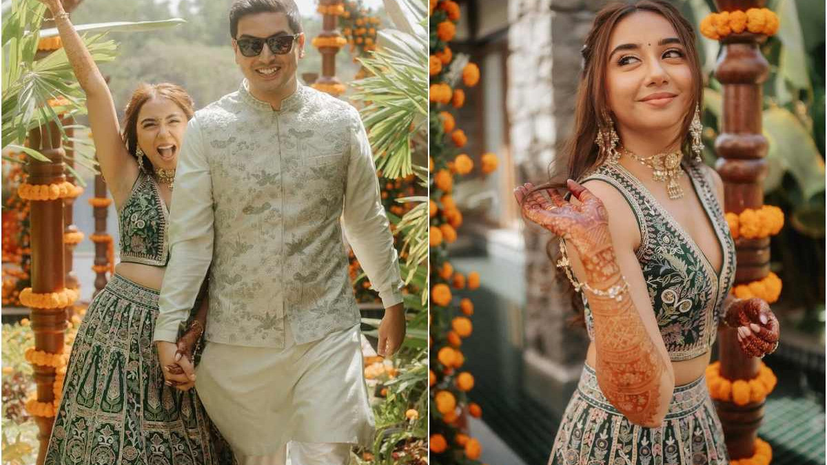 दूसरे दिन के प्री-वेडिंग फंक्शन की इन तस्वीरों में प्राजक्ता कोली ग्रीन कलर के हैवी एम्ब्रॉयडरी वाले स्कर्ट-क्रॉप टॉप में नजर आ रही हैं। मैचिंग गोल्डन नेकलेस और लॉन्ग ईयररिंग्स के साथ उन्होंने ज्वेलरी पेयर की। माथे पर बिंदी और हाथों में मेहंदी गाए उन्होंने अपना प्री-वेडिंग लुक फ्लॉन्ट किया है। हालांकि तस्वीरों से ये पता नहीं चल रहा है कि ये किस फंक्शन की तस्वीरें हैं।