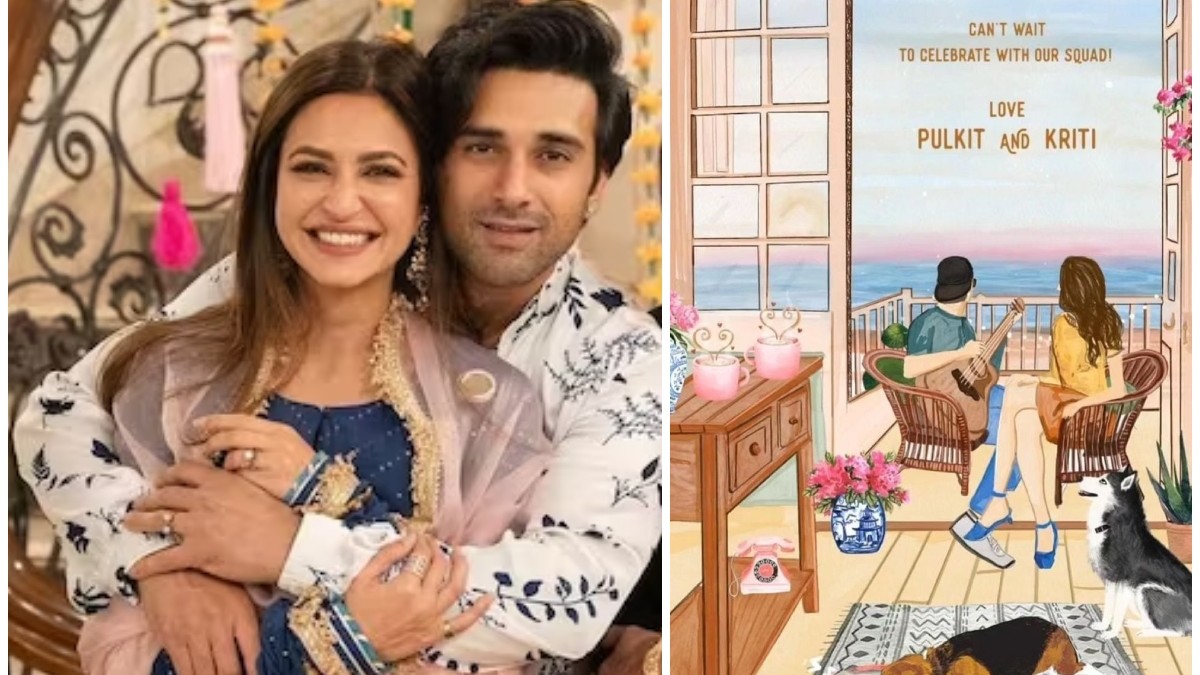 शादी के कार्ड की बात करें तो इसमें दो लोग चेयर पर बैठे नजर आ रहे हैं, इसमें कृति खरबंदा और पुलकित सम्राट का ही एनिमेटेड कैरेक्टर नजर आ रहा है। कार्ड में घर के बालकनी के व्यू की झलक है जिसमें पुलकित हाथ में गिटार लिए बालकनी में बैठे हुए हैं और उनके साथ कृति भी म्यूजिक का आनंद लेती दिख रही हैं। उनके आस-पास उनके डॉग्स भी बैठे दिख रहे हैं। कार्ड पर लिखा है- 'अपने लोगों के साथ इस जश्न को मनाने का सब्र नहीं हो रहा है। लव पुलकित एंड कृति।'