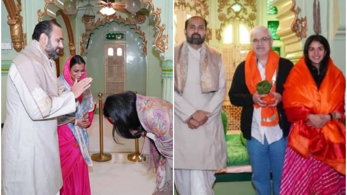 तस्वीरों में राधिका के पिता वीरेन मर्चेंट और मां नजर आईं। भगवान के दरबार में राधिका ने शीश झुकाकर नत्मस्तक किया और श्रीनाथजी का आशीर्वाद लिया। चेहरे पर मुस्कान लिए उनका हर अंदाज लोगों को भा गया।