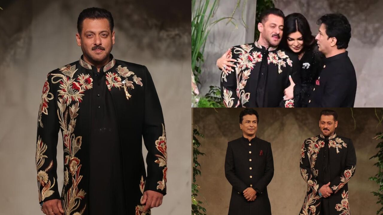 सलमान ने शो में एक खूबसूरत काले रंग की शेरवानी पहनी थी जिसपर पारंपरिक भारतीय सिलाई के साथ मॉडर्न टच था। उनकी ओपन-फ्रंट जैकेट में सोने और गुलाबी रंग की फूलों की कढ़ाई थी, जो उनके आउटफिट को बेहतरीन बना रही थी।