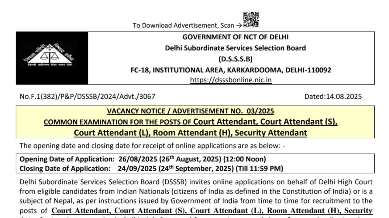 DSSSB Recruitment 2025: दिल्ली अधीनस्थ सेवा चयन बोर्ड (DSSSB) ने कोर्ट अटेंडेंट, रूम अटेंडेंट और सिक्योरिटी अटेंडेंट समेत कुल 334 पदों के लिए भर्ती अधिसूचना जारी की है। ऑनलाइन आवेदन 26 अगस्त से 24 सितंबर 2025 तक किए जा सकेंगे।