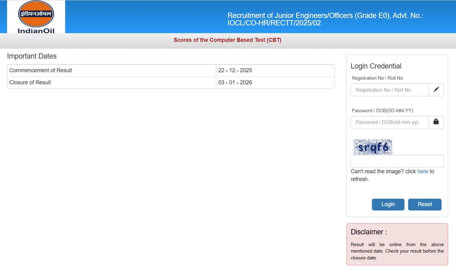 IOCL की ओर से जारी सूचना के अनुसार, JE रिजल्ट डाउनलोड करने का लिंक 3 जनवरी 2026 तक सक्रिय रहेगा, इसलिए उम्मीदवारों को सलाह दी जाती है कि वे समय रहते अपना स्कोरकार्ड डाउनलोड कर लें। CBT परीक्षा में सफल अभ्यर्थी अब चयन प्रक्रिया के अगले चरण के लिए पात्र माने जाएंगे, जो पद के अनुसार अलग-अलग हो सकते हैं।