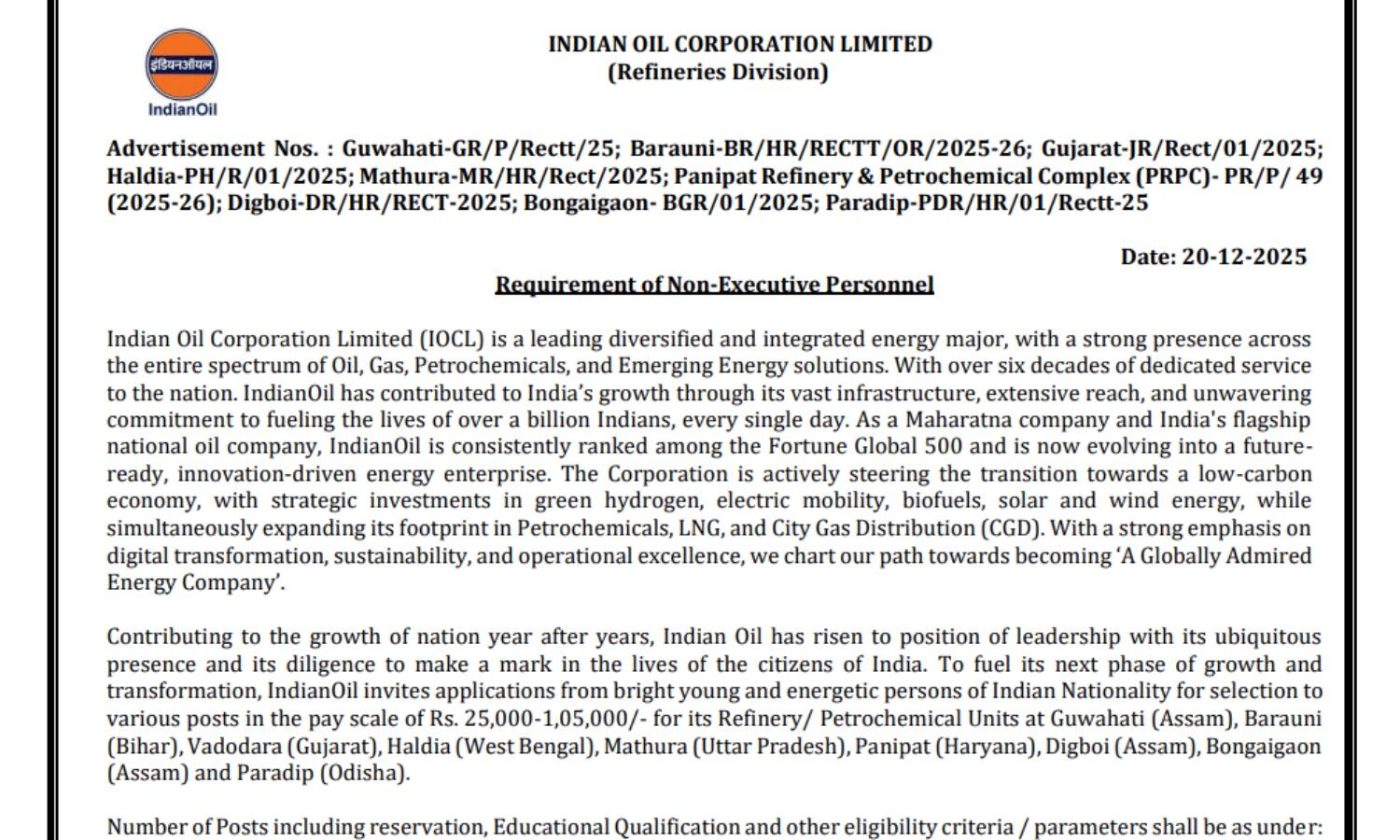 IOCL नॉन-एग्जीक्यूटिव पर्सनल भर्ती 2026 के तहत आवेदन करने का आज 9 जनवरी 2026 आखिरी दिन है।
