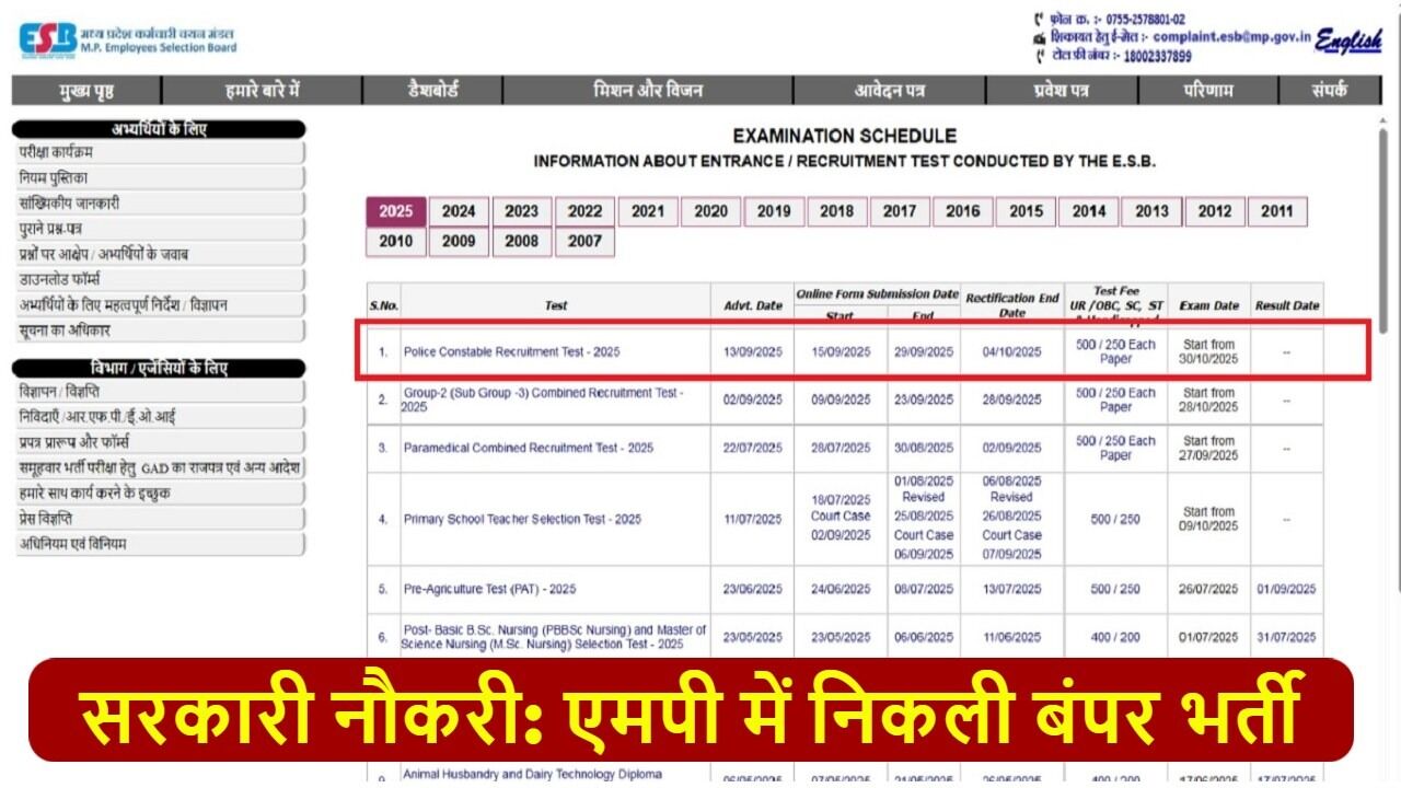 MP Police Bharti 2025: मध्यप्रदेश में 7500 पुलिस पदों पर भर्ती की घोषणा। आवेदन 15 सितंबर से शुरू, आखिरी तारीख 29 सितंबर। परीक्षा 30 अक्टूबर को भोपाल, इंदौर, ग्वालियर सहित कई शहरों में होगी।