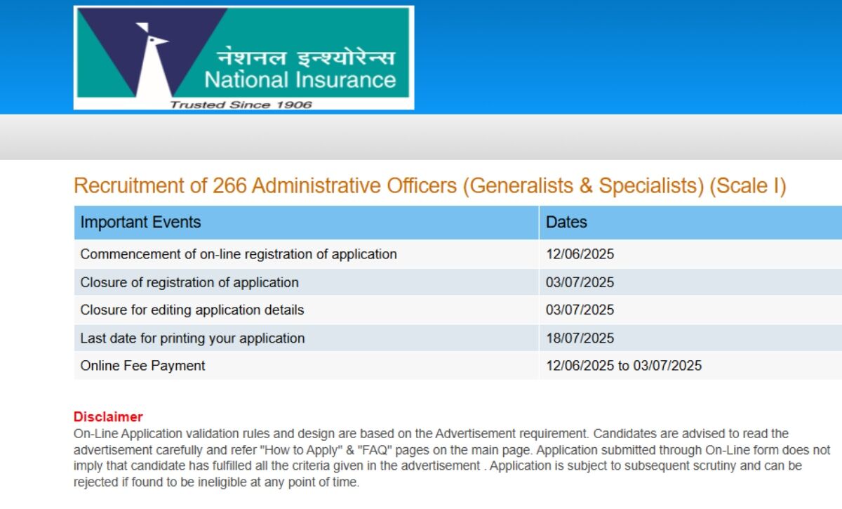 NICL Recruitment 2025: 266 प्रशासनिक अधिकारी पदों के लिए आवेदन शुरू, जानें आवेदन प्रक्रिया, योग्यता और परीक्षा तिथि