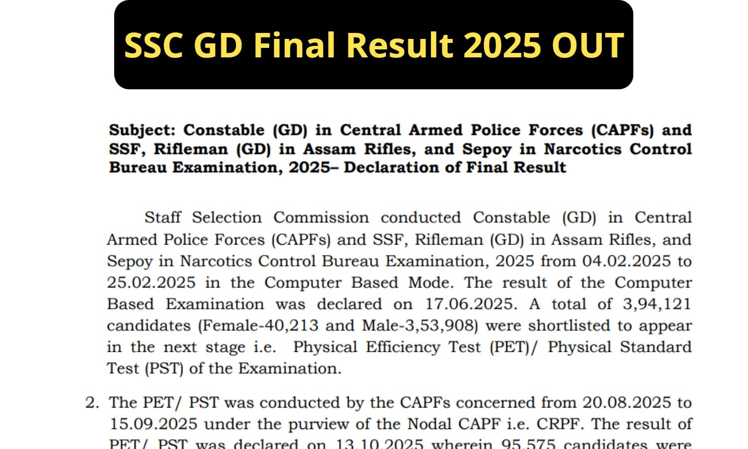 SSC GD Final Result 2025 OUT: रिजल्ट देखने के लिए डायरेक्ट लिंक।