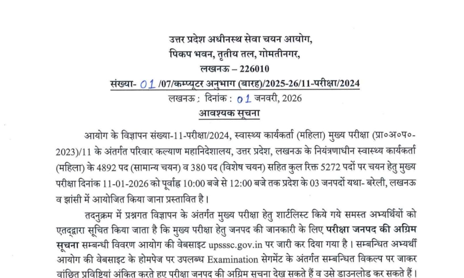 UPSSSC ANM भर्ती 2026 के तहत स्वास्थ्य कार्यकर्ता महिला की मुख्य परीक्षा 11 जनवरी को होगी।