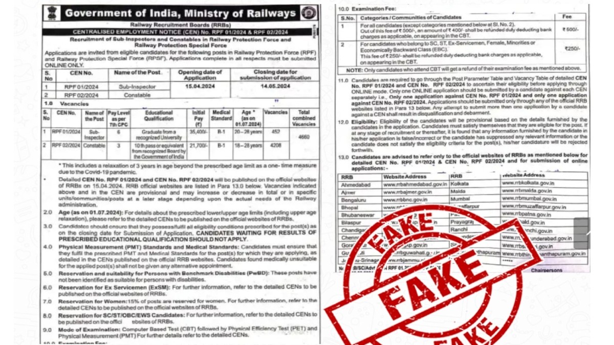 फर्जी नोटिस में आरआरबी आरपीएफ में 4660 रिक्तियों के लिए आवेदन का दावा किया गया था। जिसमें 452 सब इंस्पेक्टर और 4208 कांस्टेबल की भर्ती के लिए एप्लीकेशन विंडो 15 अप्रैल 2024 से 14 मई 2024 तक ओपन होने की बात थी।