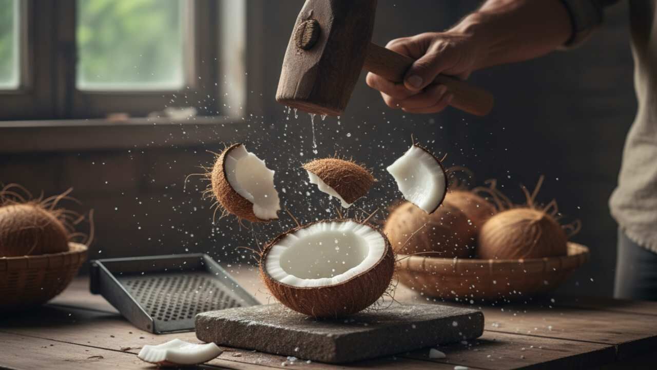 सही जगह पर मारें हथौड़ा: अक्सर लोग नारियल को कहीं भी मारना शुरू कर देते हैं, जिससे ना वो ठीक से टूटता है और ना ही गिरी बचती है। नारियल को उसकी सेंटर लाइन के अनुसार घुमाकर देखें। जहां हल्का सा गोल घेरा सा दिखता है, वहीं मारें। एक पत्थर या हथौड़े से हल्की–हल्की चोट मारते हुए उसे घुमाते रहें, कुछ ही मिनटों में नारियल टूट जाएगा।