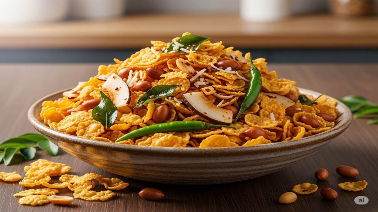 कॉर्नफ्लेक्स मिक्सचर में मूंगफली, भुनी हुई चना दाल, करी पत्ता और कुछ खास मसालों का इस्तेमाल होता है। इन सामग्रियों से मिक्सचर का स्वाद काफी बढ़ जाता है। जानते हैं टेस्टी कॉर्नफ्लेक्स मिक्सचर बनाने का तरीका।