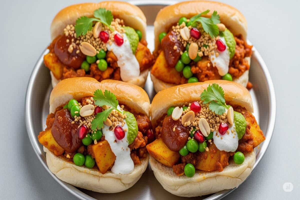 पाव को तैयार करना: एक पाव को बीच से काटें, लेकिन पूरी तरह से अलग न करें। पाव के अंदर की दोनों साइड पर हरी चटनी और लहसुन चटनी लगाएं। अब उसमें तैयार आलू स्टफिंग भरें। ऊपर से प्याज, सेव और थोड़ा सा अनार डालें।