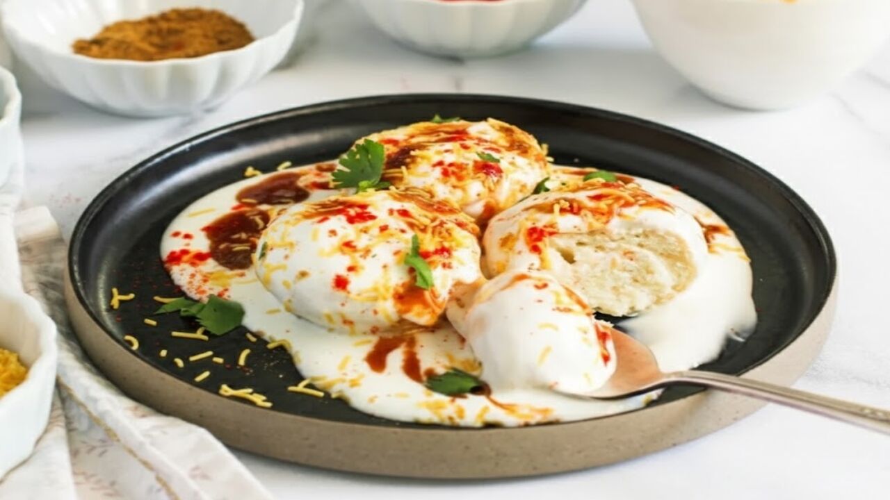 अब उन्हें पानी से निकालकर धीरे से निचोड़ लें। एक प्लेट में रखकर ऊपर से दही डालें, फिर मीठी और हरी चटनी डालें। अब लाल मिर्च पाउडर, भुना जीरा पाउडर और नमक छिड़कें। चाहें तो ऊपर से सेव, अनार दाने या कटा हुआ धनिया डालकर गार्निश करें।