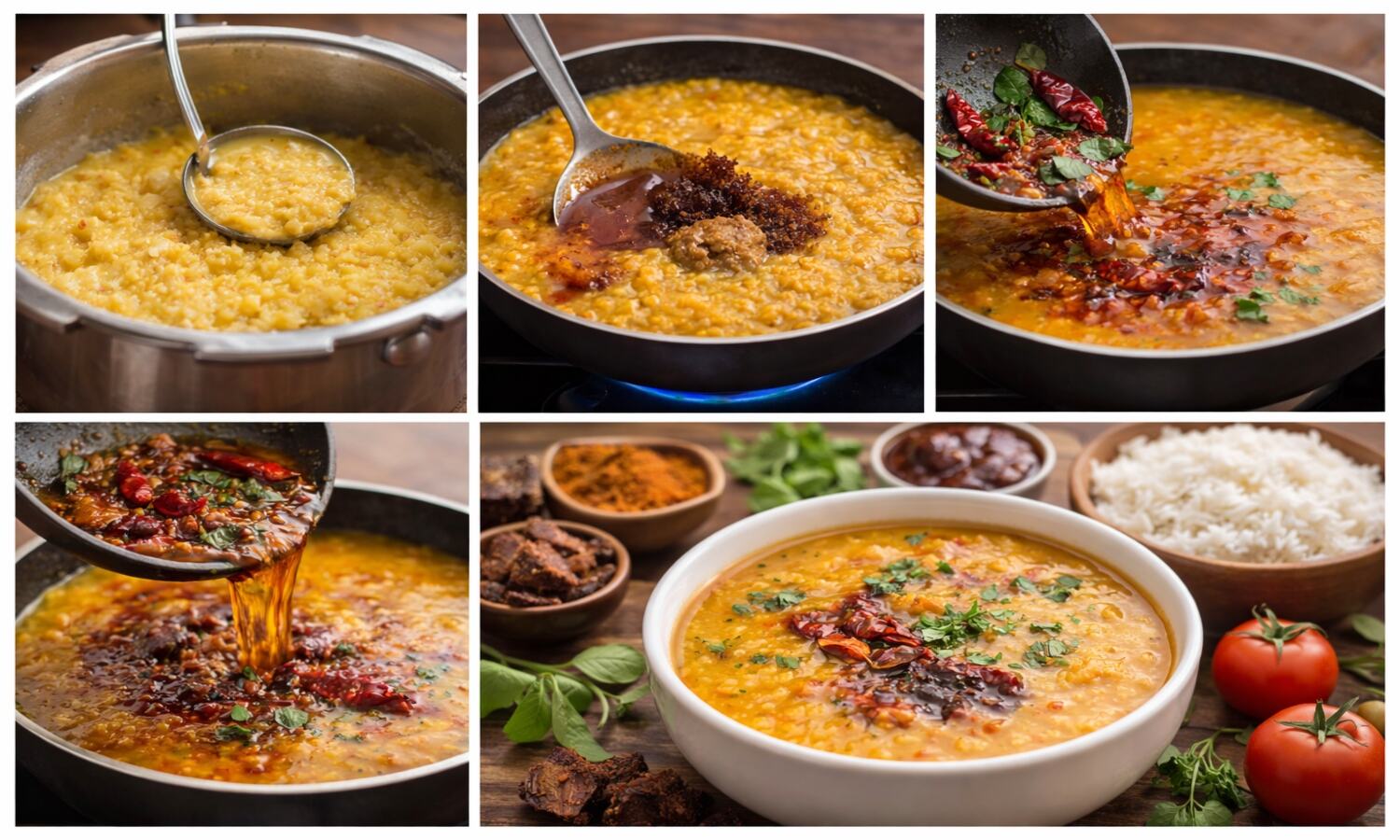 एक कड़ाही में घी या तेल गर्म करें। इसमें राई डालें, जब चटकने लगे तो जीरा, सूखी लाल मिर्च, करी पत्ता और हींग डालें। अब धनिया पाउडर और लाल मिर्च पाउडर डालकर हल्का सा भूनें और तुरंत यह तड़का दाल में डाल दें।