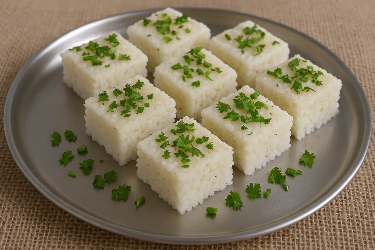 ढोकले को हल्का ठंडा होने दें फिर चौकोर टुकड़ों में काटें। ऊपर से हरा धनिया छिड़कें। चाहें तो व्रत वाली हरी चटनी या दही के साथ सर्व करें।