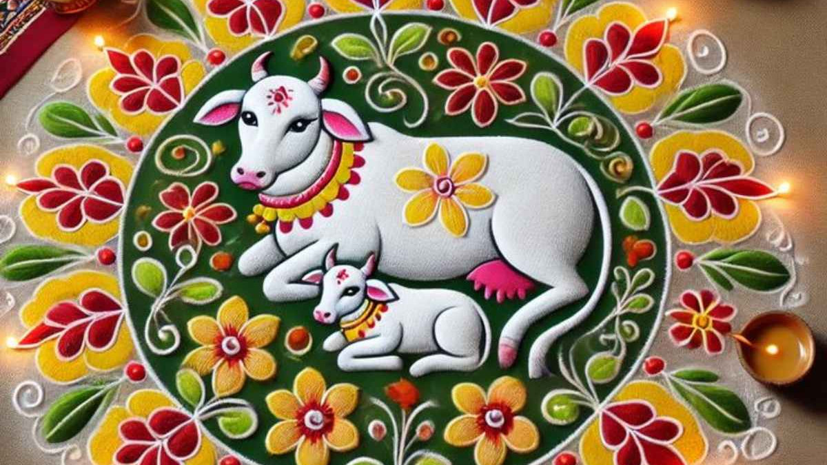 पोंगल पर गाय और कृषि से जुड़ी रंगोली डिजाइन बानाएं।