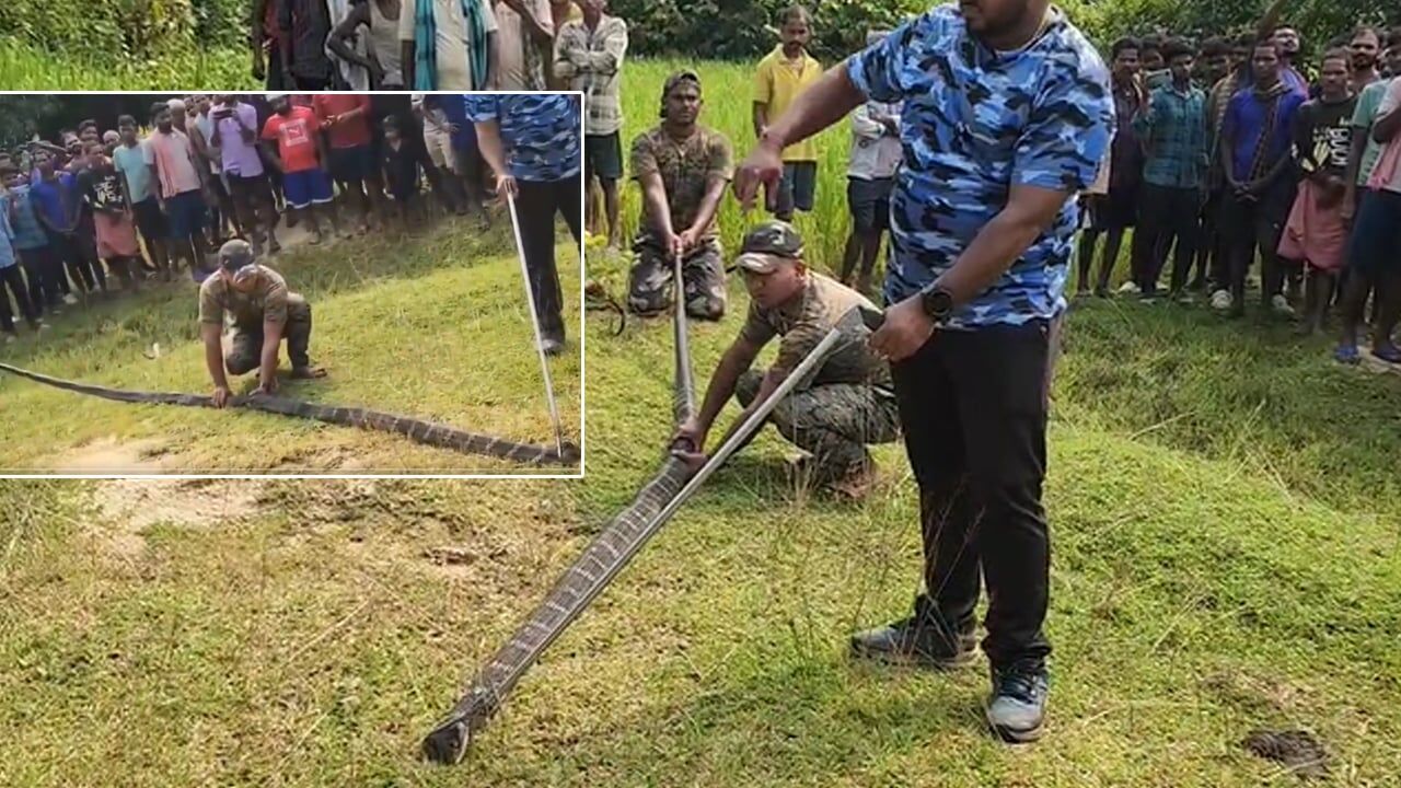 मयूरभंज में 14 फुट लंबे किंग कोबरा को रेस्क्यू करते वन विभाग और स्नेक हेल्पलाइन के सदस्य।