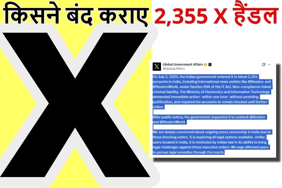 - X के ग्लोबल गवर्नमेंट अफेयर्स हैंडल के मुताबिक, भारत सरकार IT मंत्रालय से 3 जुलाई को उसे एक आदेश मिला, जिसमें 1 घंटे के भीतर 2,355 अकाउंट्स बिना कारण बताए ब्लॉक करने को कहा गया। इन अकाउंट्स में Reuters और ReutersWorld जैसे महत्वपूर्ण अंतरराष्ट्रीय मीडिया संस्थानों के एकाउंट शामिल थे।