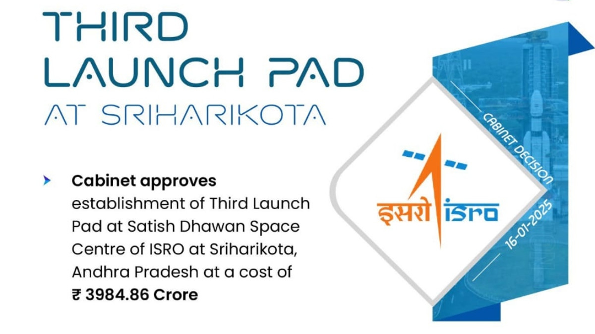 Sriharikota Third Satellite Launch Pad: केंद्रीय मंत्रिमंडल ने श्रीहरिकोटा के सतीश धवन अंतरिक्ष केंद्र पर तीसरे लॉन्च पैड (थर्ड लॉन्च पैड) स्थापित करने की मंजूरी दे दी। इस परियोजना की कुल लागत 3,985 करोड़ रुपए है।