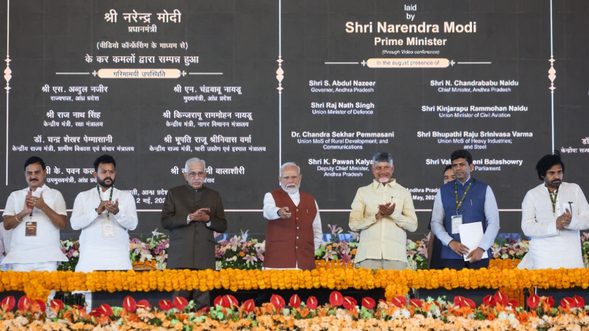PM Modi in Andhra Pradesh: प्रधानमंत्री नरेंद्र मोदी ने शुक्रवार (2 मई) को आंध्र प्रदेश में 58,000 करोड़ रुपए से अधिक की लागत वाली विभिन्न परियोजनाओं का शिलान्यास और उद्घाटन किया। इनमें हरित राजधानी अमरावती का पुन: निर्माण भी शामिल है, जो मुख्यमंत्री एन चंद्रबाबू नायडू का 'ड्रीम प्रोजेक्ट' है। उद्घाटन समारोह में पीएम मोदी के साथ आंध्र प्रदेश के मुख्यमंत्री चंद्रबाबू नायडू और उपमुख्यमंत्री पवन कल्याण भी उपस्थित थे।