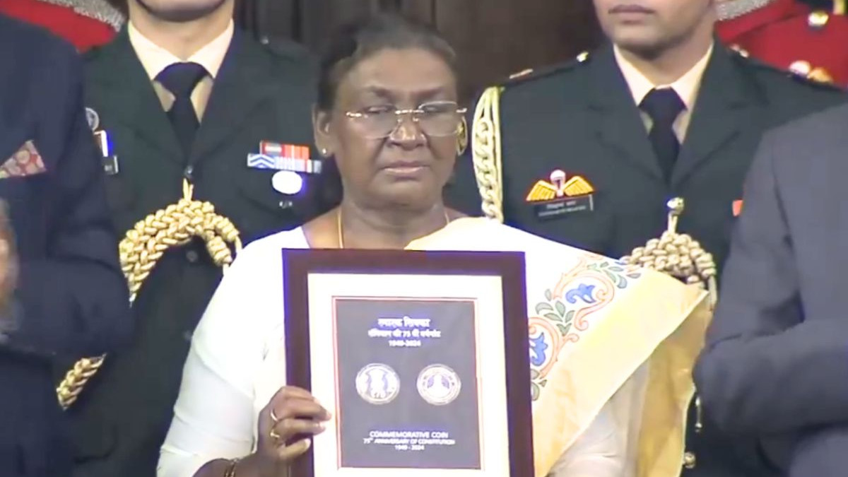 #WATCH | Delhi: President Droupadi Murmu releases a commemorative coin on the occasion of 75 years of the Constitution of India at Samvidhan Sadan. pic.twitter.com/9v4mgPNMUp