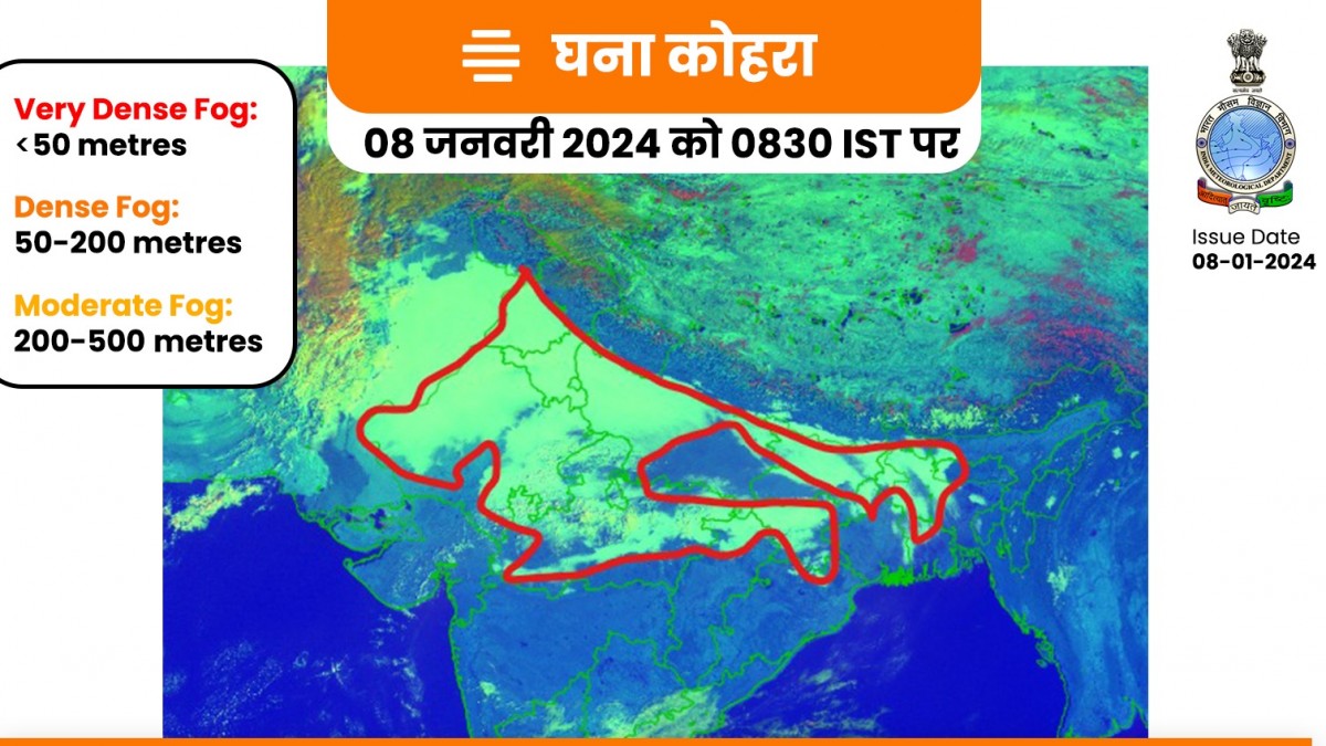 #WeatherUpdate | *Fog conditions observed* (at 0530 hours IST of today, 08.01.2024): *Very dense fog*in isolated pockets of Punjab, Haryana-Chandigarh, Uttar Pradesh, Rajasthan, Bihar; *Dense fog* in isolated pockets of Madhya Pradesh; pic.twitter.com/XgWKk09hBa