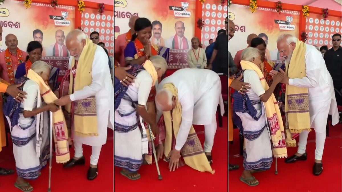 #WATCH | Prime Minister Narendra Modi felicitates Padma Shri awardee Purnamasi Jani & seeks blessings by teaching her feet, during his public meeting in Odisha's Kandhamal. pic.twitter.com/sWjRAt69Jz