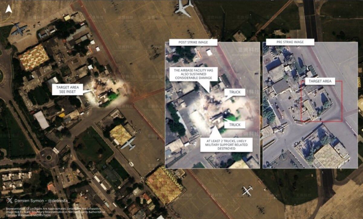 रावलपिंडी में स्थित नूर खान एयरबेस पाकिस्तान की सबसे महत्वपूर्ण रणनीतिक हवाई पट्टी है। सैटेलाइट इमेज में इसके ध्वस्त बुनियादी ढांचे और ग्राउंडेड सपोर्ट व्हीकल को स्पष्ट रूप से दिखाया गया है।