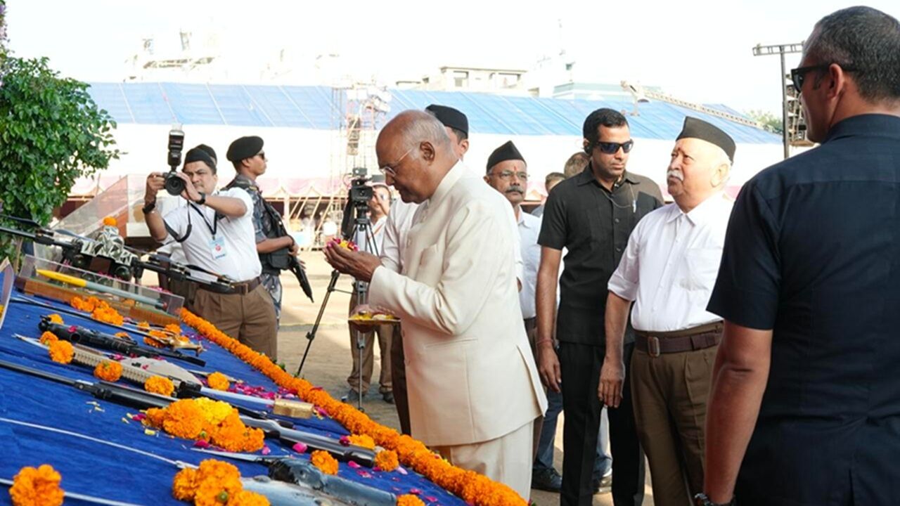 RSS शताब्दी विजयादशमी उत्सव: मोहन भागवत ने शस्त्र पूजन किया, पूर्व राष्ट्रपति रामनाथ कोविंद मुख्य अतिथि।