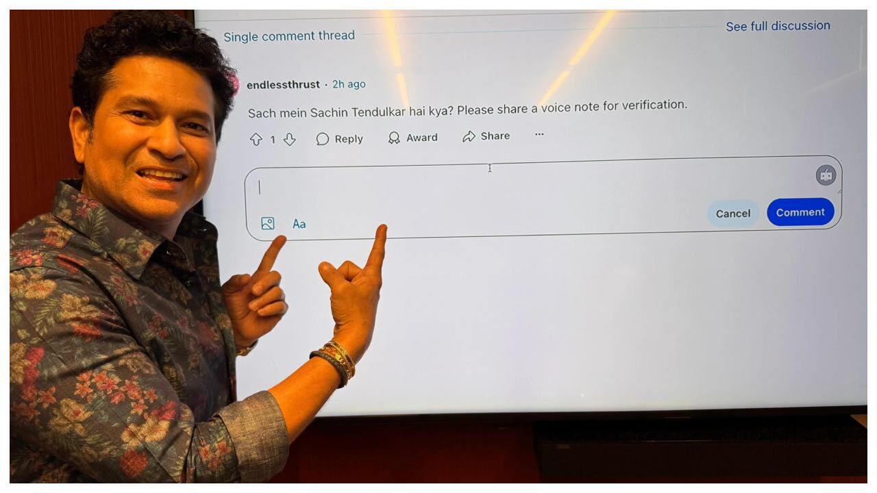 Sachin Tendulkar reddit session: सचिन तेंदुलकर ने सोमवार को रेडिट आस्क मी एनीथिंग (AMA) सेशन आयोजित करके अपने फैंस को खूब हंसाया। इस सेशन में सचिन से फैंस ने क्रिकेट के सफ़र और उससे आगे के बारे में सवाल पूछे। सबसे यादगार पलों में से एक तब आया जब एक यूज़र ने शक जताया कि क्या वाकई इस अकाउंट के पीछे मास्टर ब्लास्टर ही हैं। फैन ने सेशन के दौरान ही पूछ लिया कि क्या सच में सचिन तेंदुलकर हैं? कृपया एक वॉइस नोट शेयर करें, ताकि सच्चाई पता चल सके?