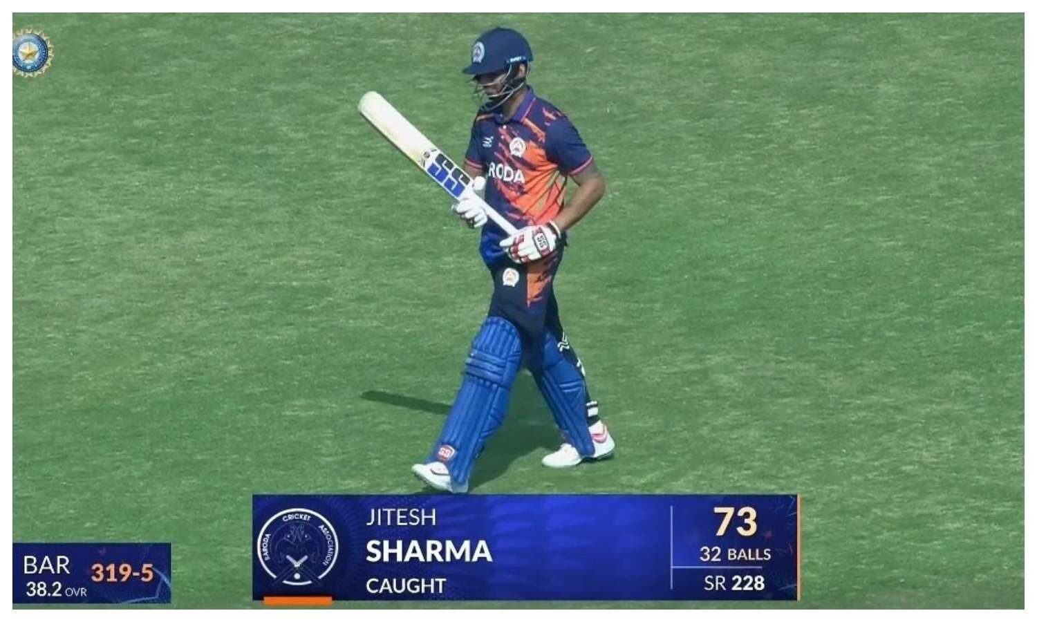 जितेश ने महज 23 गेंदों में अपना अर्धशतक पूरा किया। उनकी पारी में 4 छक्के और 8 चौके शामिल रहे। 39वें ओवर में कपूर ने उन्हें आउट किया लेकिन तब तक वह अपना काम कर चुके थे। जितेश के आउट होने के समय बड़ौदा का स्कोर 38.3 ओवर में 319/6 था। इसके बाद मोलिया और निनाद राठवा ने सातवें विकेट के लिए 64 रन जोड़े। मोलिया ने 106 गेंदों में 103 रन की शानदार पारी खेली जबकि राठवा ने 38 रन बनाए। हालांकि अंत में बड़ौदा ने 18 रन के भीतर चार विकेट गंवाए और टीम 49.1 ओवर में 391 रन पर सिमट गई।
