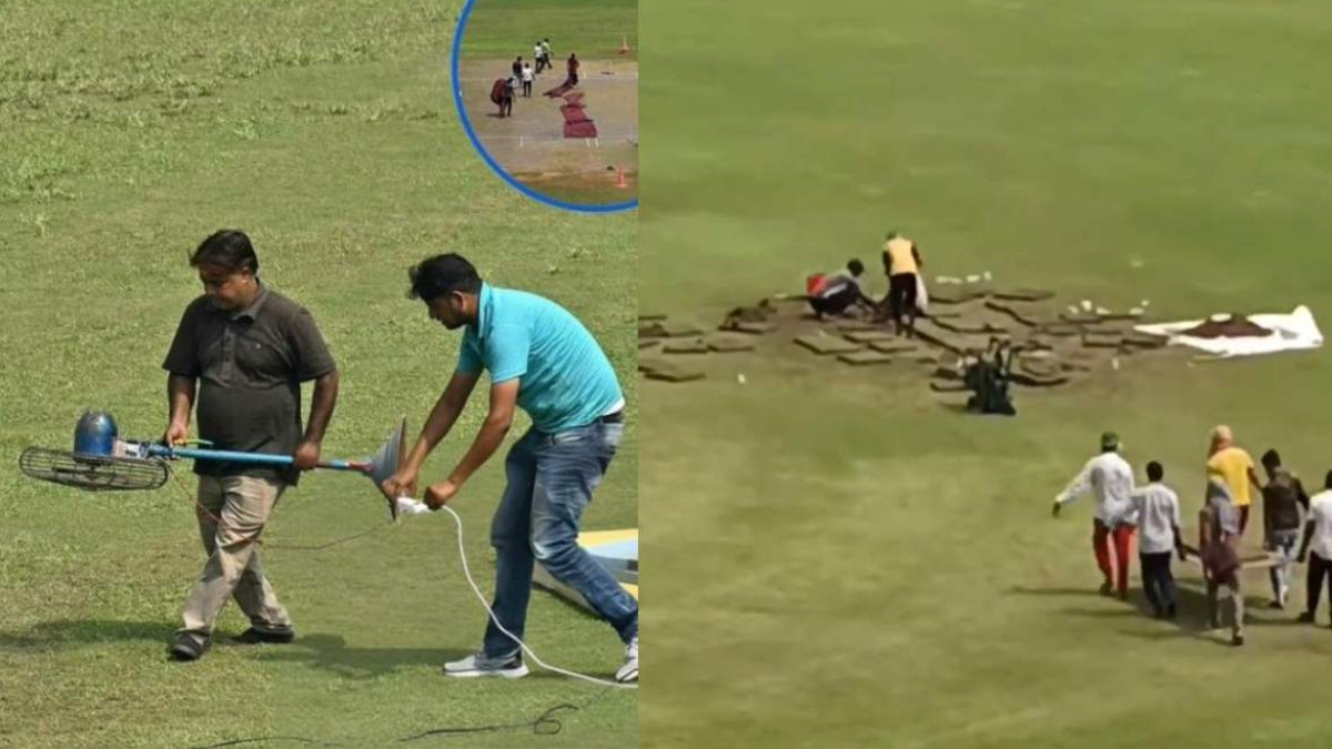 अफगानिस्तान और न्यूजीलैंड के बीच एकमात्र टेस्ट सोमवार 9 सितंबर को शुरू होना था, लेकिन बारिश और मैदान के गीले होने के चलते 2 दिन का खेल तो खराब हो ही गया। सोमवार शाम करीब एक घंटे तक बारिश हुई, जिसके बाद अगले दिन का खेल प्रभावित हुआ। हालांकि मंगलवार दोपहर तक बारिश नहीं हुई है, लेकिन अंपायरों ने पहले ही स्टंप्स की घोषणा कर दी है। मिड-ऑन और मिडविकेट क्षेत्र मुख्य रूप से चिंता का विषय है। इससे निपटने के लिए मैदानकर्मियों को अभ्यास क्षेत्र से घास के सूखे टुकड़े लाते और उन्हें मुख्य मैदान के आउटफील्ड में स्थापित करते देखा गया, जिसका वीडियो सोशल मीडिया पर वायरल हो रहा है। इसके अलावा, घास के टुकड़े सुखाने के लिए टेबल फैन का भी उपयोग करते देखा गया।