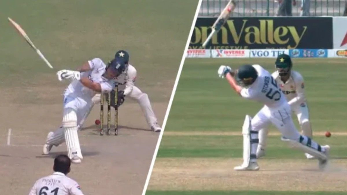 बेन स्टोक्स जिस अंदाज में मुल्तान टेस्ट की दूसरी पारी में आउट हुए, ऐसा क्रिकेट में कम ही देखने को मिलता है। दरअसल, स्टोक्स ने एक छोर से इंग्लैंड के विकेट गिरते देख आक्रामक अंदाज में बल्लेबाजी शुरू कर दी थी। उन्होंने 36 गेंद में 37 रन ठोक दिए थे। बाएं हाथ के स्पिनर नौमान अली की एक गेंद पर स्टोक्स ने आगे निकलकर हवाई फायर करना चाहा। लेकिन, पसीने की वजह से बल्ला उनके हाथ से फिसलकर दूर जा गिरा और गेंद सीधा विकेटकीपर मोहम्मद रिजवान के ग्लव्स में चली गई। स्टोक्स ने पीछे लौटने की कोशिश की। लेकिन बल्ला हाथ में नहीं होने की वजह से वो लौट नहीं पाए और स्टम्प हो गए।