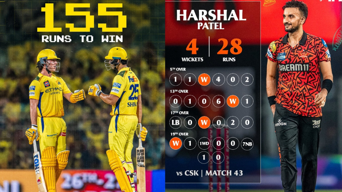 SRH के गेंदबाजों ने शानदार प्रदर्शन करते हुए CSK को 19.5 ओवर में 154 रन पर ही समेट दिया। हर्षल पटेल ने सर्वाधिक 4 विकेट लिए। जबकि कप्तान पैट कमिंस और जयदेव उनादकट के खाते में 2-2 विकेट गए। इसके अलावा, मोहम्मद शामी और कामिंडू मेंडिस को 1-1 विकेट मिले।