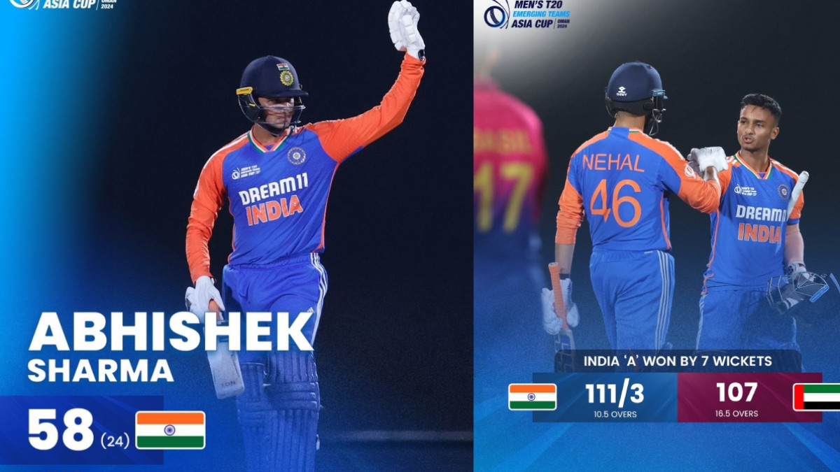 IND A vs UAE: इंडिया ए ने यूएई को 7 विकेट से हरा दिया। अभिषेक शर्मा ने 24 गेंदों पर 58 रन की पारी खेली।