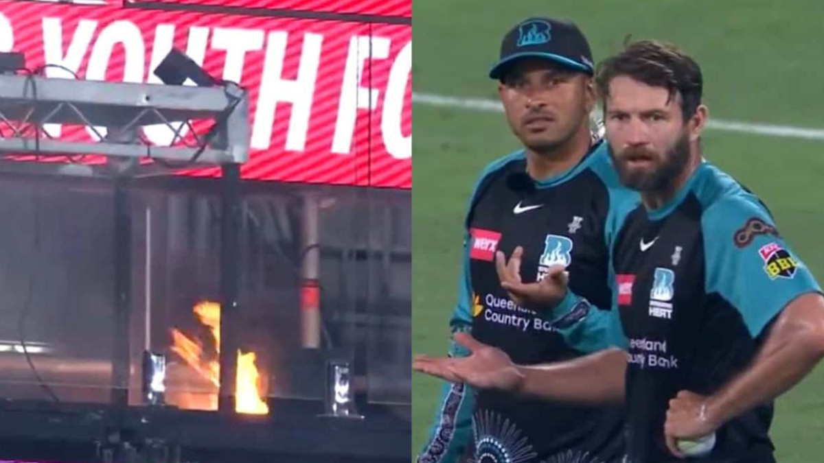 bbl fire video: ब्रिसबेन के गाबा स्टेडियम में ब्रिसबेन हीट और होबार्ट हरिकेन्स के बीच खेले जा रहे बिग बैश लीग मैच के दौरान अचानक स्टेडियम के एक हिस्से में आग लग गई। इसकी वजह से मैच रोकना पड़ा।