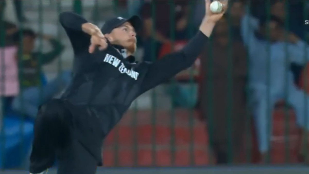 ग्लेन फिलिप्स ने यह कैच पाकिस्तान की पारी के 10वें ओवर में पकड़ा, जब मोहम्मद रिजवान बाबर आजम के साथ साझेदारी बनाने की कोशिश कर रहे थे। न्यूजीलैंड के कप्तान मिचेल सैंटनर ने तेज गेंदबाज विलियम ओ'रुरके को गेंद थमाई, और उनके ओवर में फिलिप्स का जबरदस्त कैच देखने को मिला।