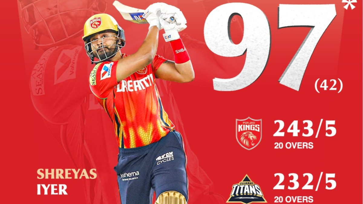 गुजरात टाइटंस के कप्तान शुभमन गिल ने टॉस जीतकर पहले गेंदबाजी करने का फैसला किया। पहले बल्लेबाजी करते हुए पंजाब किंग्स ने 20 ओवर में पांच विकेट खोकर 243 रन बनाए और गुजरात को 244 रन का विशाल लक्ष्य दिया। श्रेयस अय्यर ने शानदार बल्लेबाजी करते हुए 42 गेंदों पर 97 रन की तूफानी पारी खेली। लेकिन वह अपने पहले आईपीएल शतक से चूक गए। उन्होंने अपनी इस शानदार पारी में पांच चौके और नौ छक्के जड़े।