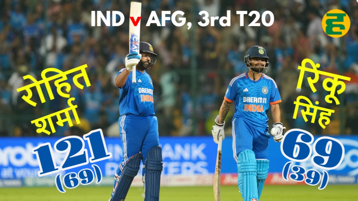 भारत और अफगानिस्तान के बीच तीसरे मुकाबले में भारतीय टीम ने 20 ओवर में चार विकेट के नुकसान के साथ 212 रन बनाए। इसके साथ ही कप्तान रोहित शर्मा और रिंकू सिंह ने धमाकेदार प्रदर्शन दिखाया। वहीं कप्तान रोहित शर्मा ने चौक मारकर अपना शतक भी पूरा किया और रिंकू सिंह ने भी अपना अर्धशतक पूरा किया। दोनों के बीच शतकीय साझेदारी हुई।