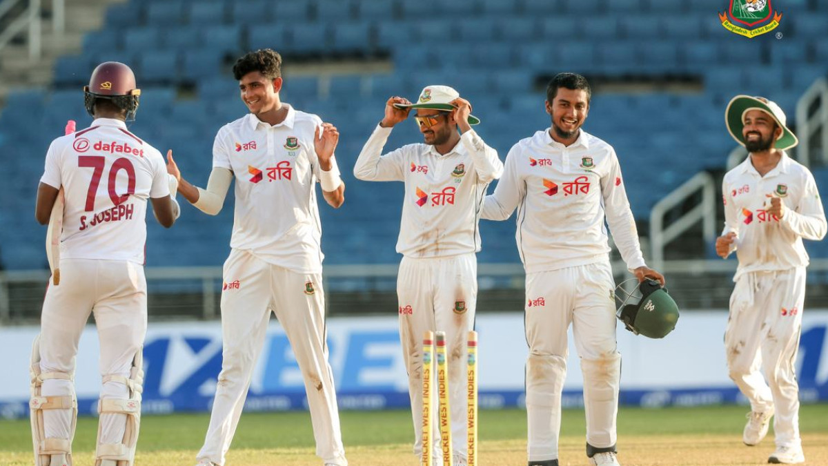मैच की अगर बात करें तो बांग्लादेश ने पहली पारी में 164 रन पर बनाए थे। इसके जवाब में वेस्टइंडीज की टीम 146 रन पर ही ढेर हो गई। इस तरह बांग्लादेश ने पहली पारी के आधार पर 18 रन की लीड ली थी। दूसरी पारी में बांग्लादेश ने जाकिर अली (91), शादमान इस्लाम (46) और कप्तान मेहदी हसन मिराज (42) की पारियों की बदौलत 268 रन बनाए। इस तरह कैरेबियाई टीम को 287 रन का लक्ष्य मिला, जिसका पीछा करते हुए वेस्टइंडीज की टीम चौथे दिन 50 ओवर में 185 रन पर ऑल आउट हो गई।