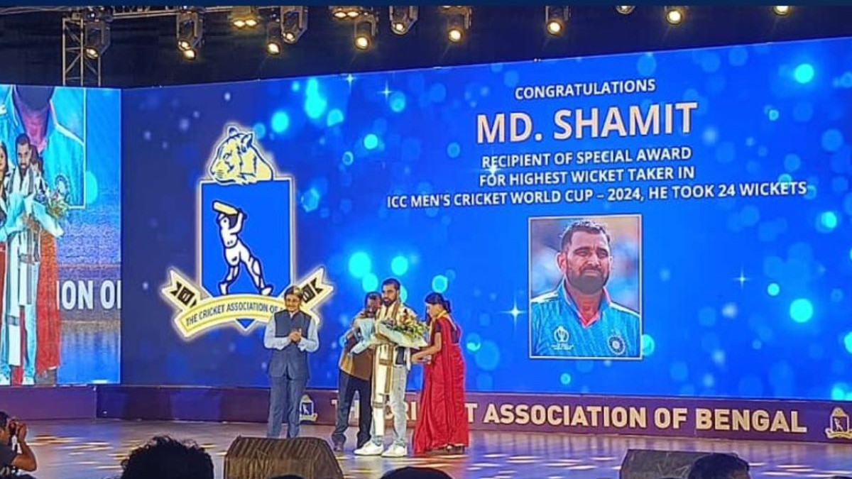 Mohammed Shami CAB award: कोलकाता में आयोजित क्रिकेट एसोसिएशन ऑफ बंगाल (CAB) के वार्षिक पुरस्कार समारोह में भारतीय तेज गेंदबाज मोहम्मद शमी को उनके शानदार प्रदर्शन के लिए सम्मानित किया गया। शमी, घरेलू क्रिकेट में बंगाल का प्रतिनिधित्व करते हैं। उन्होंने ICC पुरुष वनडे वर्ल्ड कप 2023 में शानदार प्रदर्शन किया था, जिसके लिए उन्हें पुरस्कार दिया गया। शमी ने वर्ल्ड कप में 7 मैचों में 24 विकेट लेकर सबसे ज्यादा विकेट लेने वाले गेंदबाज का खिताब हासिल किया था। लेकिन इस सम्मान समारोह में CAB की ओर से एक बड़ी गलती हो गई, जिसकी हर तरफ चर्चा हो रही है।