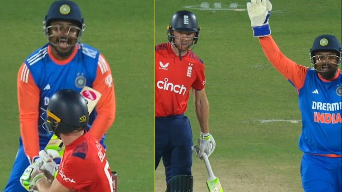 इंग्लैंड की पारी में कप्तान जोश बटलर ने वरुण चक्रवर्ती के खिलाफ रिवर्स स्वीप करने का प्रयास किया, जिसमें बटलर चूक गए और गेंद विकेट के पीछे संजू सैमसन के दस्तानों में चली गई। संजू ने कैच की अपील की, लेकिन अंपायर ने दिलचस्पी नहीं दिखाई, लेकिन संजू को कंफर्म था कि गेंद बल्ले से लगकर उनके ग्लब्ज में आई है। उन्होंने कप्तान सूर्यकुमार यादव से DRS लेने को कहा। इस पर सूर्या ने डीआरएस लिया, जिसमें देखा गया कि गेंद ने बैट का किनारा लिया था। इस तरह संजू सैमसन ने धोनी की तरह विकेट के पीछे बेहतरीन काम किया और जोश बटलर का बड़ा विकेट लेने में अहम भूमिका निभाई।