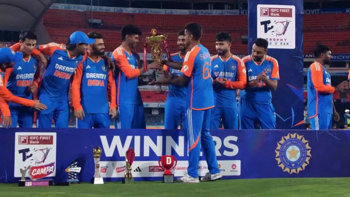 मयंक ने सीरीज के तीन मुकाबलों में 4 विकेट लिए जबकि नीतीश ने इसी सीरीज में टी20 में अपनी पहली फिफ्टी जड़ी। इन दोनों को ट्रॉफी थमाने के बाद सूर्यकुमार यादव एक कोने में हार्दिक पंड्या के साथ खड़े हो गए और खिलाड़ियों के साथ जीत का जश्न मनाया।