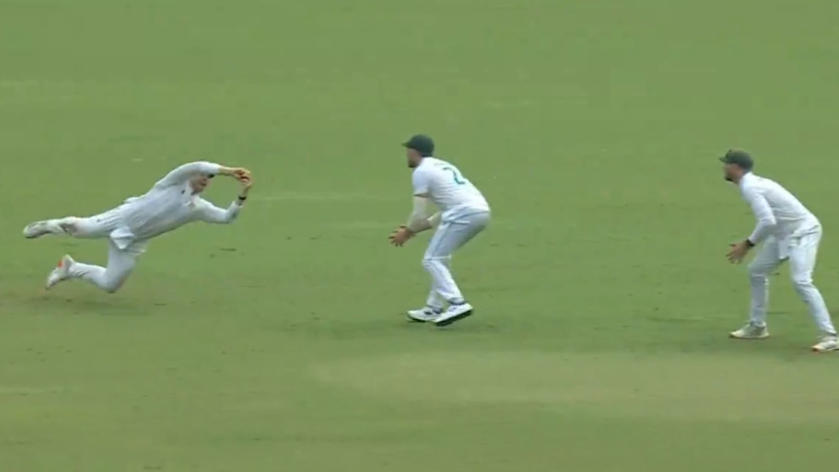 BAN vs SA: साउथ अफ्रीका और बांग्लादेश के बीच ढाका में खेले जा रहे पहले टेस्ट में ट्रिस्टन स्टब्स ने गजब का कैच लपका। अफ्रीकी खिलाड़ी स्टब्स ने अपनी बाईं और डाईव लगाते हुए लिटन दास की पारी खत्म कर दी। ट्रिस्टन स्टब्स का कैच वायरल हो रहा है। टेस्ट के पहले दिन बांग्लादेश की पारी 106 रन पर सिमट गई। इसके बाद अफ्रीका ने भी 140 के स्कोर पर 6 विकेट गंवा दिए हैं। पहले दिन कुल 16 विकेट गिरे जबकि रन महज 146 ही बने।